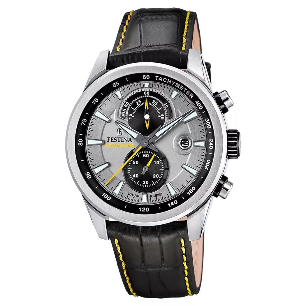 Festina Timeless, uåpnet eske, bredde 44mm på ur. Edelstål kasse, vanntett til 100m. Mineralglass. Lysindekser. Lyspeker. Datovisning. Lærreim med gul søm.
