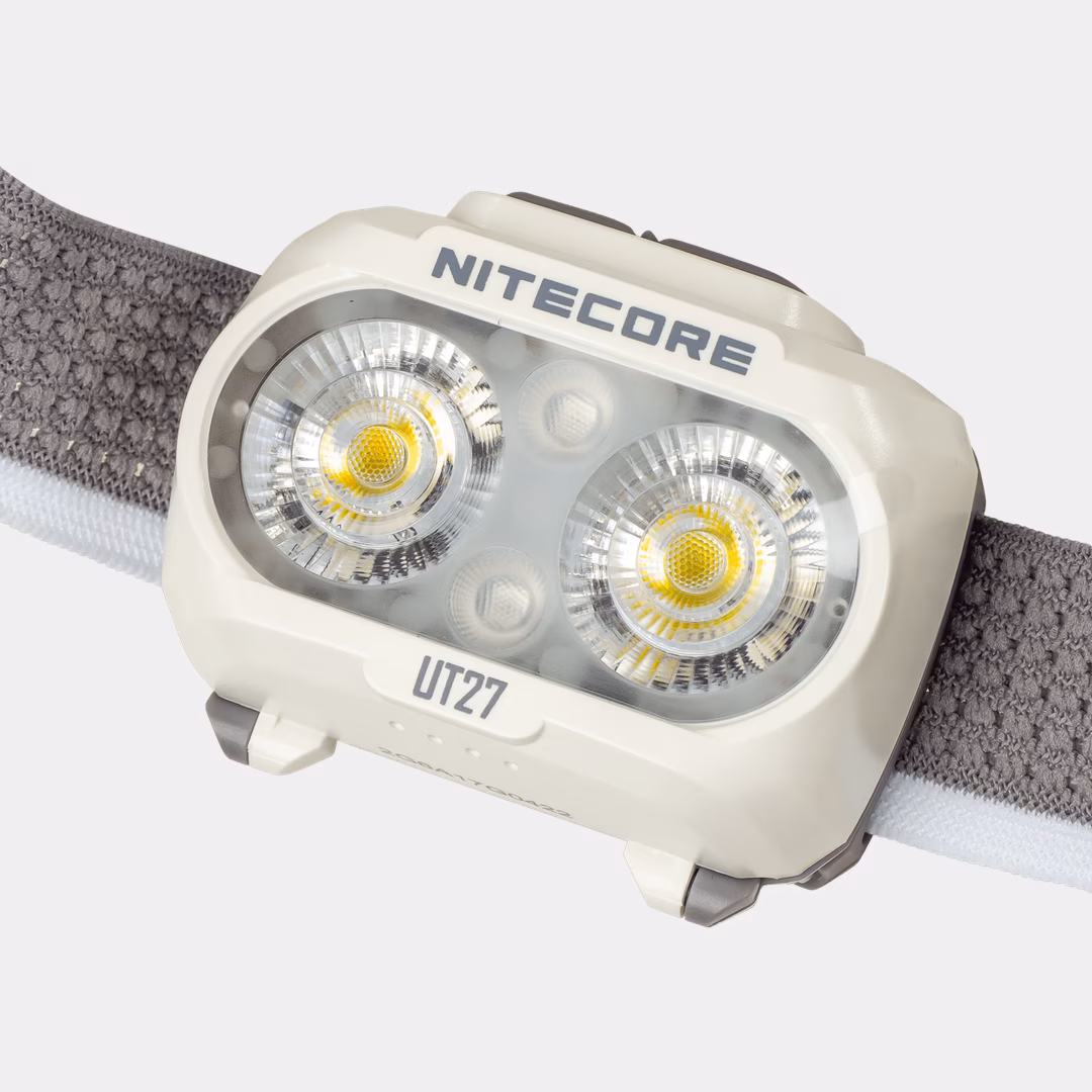 Hodelykt HVITGRÅ UTGAVE fra Nitecore UT27. Oppladbar med USB-C. Nitecore UT27 er en ultralett hodelykt som veier kun 74 gram, utviklet for løping, fotturer og utendørsaktiviteter. Den kombinerer kaldt hvitt lys (5700K), varmt lys (3000K) og rødt lys, med en maksimal lysstyrke på 800 lumen og en rekkevidde på opptil 168 meter. Den drives av et oppladbart HLB1500 Li-ion-batteri (inkludert) eller tre AAA-batterier (ikke inkludert). Hodelykten er IP66-klassifisert og støtsikker opptil 1 meter.